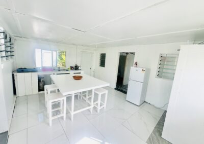Fully equipped kitchen with a stove, fridge / freezer, dining table, kettle, toaster, tea, coffee, milk, sugar, cutleries, whiteware & cookware